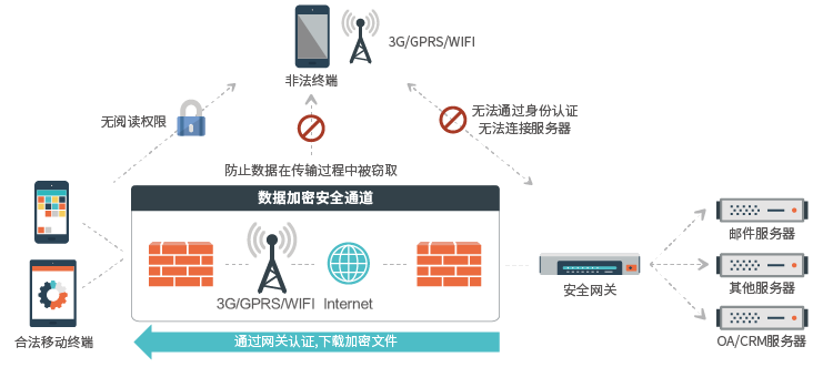 移动终端与内部服务器之间的数据交换是通过数据文件加密安全通道传输的,防止传输过程中数据被非法窃取。
