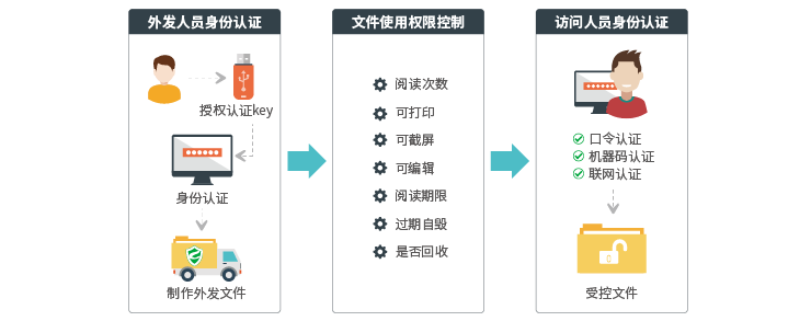 对于一些重要文档外发需要事先向上级领导进行外发申请,才能外发给客户或合作伙伴。被授权的客户或合作伙伴获得该受控外发文件后,打开时需先进行合法的身份认证,而后才能在授予的权限范围内访问。身份认证的方式包括:口令认证、机器码认证、联网认证。访问权限包括:阅读次数、可打印、可截屏、可编辑、阅读期限、过期自毁、回收等。被授权的客户或者伙伴在访问该文件时,无需在自己的电脑上安装任何插件,即可访问。