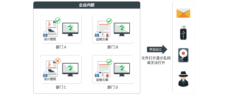 采用高效、先进的文件内核驱动层加密技术,运用256位高强度算法,在文件创建或编辑过程中自动强制加密,不影响用户操作习惯。当加密文件通过非正常渠道流转至外部,打开时便会显示乱码或无法打开,文件加密确保文件安全。