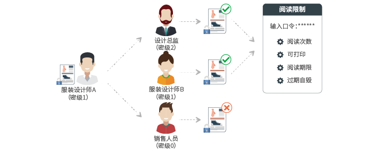 对企业内部的核心文件,如:促销方案、鞋服素材等资料的使用权限进行细粒化授权:被授权的员工获得该核心文件后,打开时必须输入作者赋予的正确口令,才能访问该核心文件;核心文件的访问权限的控制包括:阅读次数、次数打印、是否可截屏、是否可编辑、阅读时间、禁止删除、过期自毁等,保障核心文件安全使用。